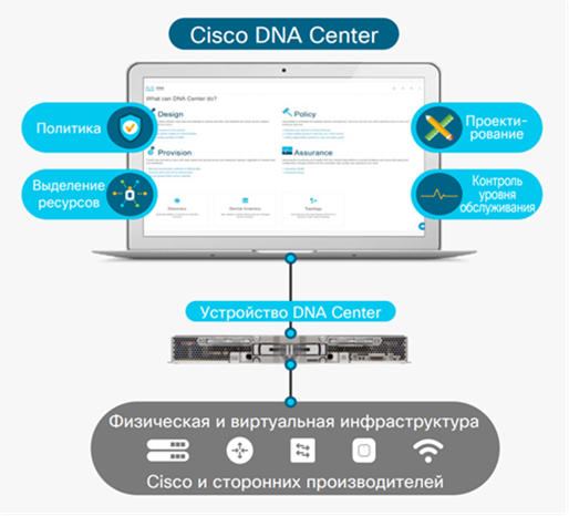 Cisco DNA Center. Cisco DNA Center – это новая архитектура для корпоративных сетей для поддержки роста бизнеса и внедрения инноваций. Ключевым принципом системы является автоматизация и надежность за счет применения специализированных систем управления развертывания инфраструктуры. К преимуществам таких решений однозначно можно отнести глубокую интеграцию с обслуживаемым решением и, как следствие, богатые возможности настройки. Также они позволяют поддерживать высокое качество приложений и обеспечивать их безопасность [22].