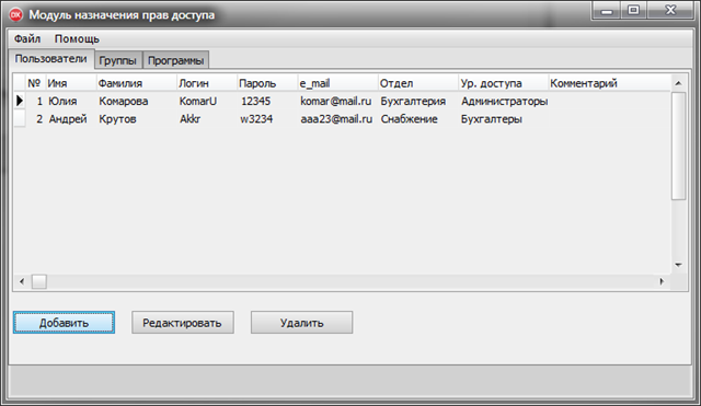Главное меню (см. рис. 8) обеспечивает добавление новых данных о пользователях, о рабочих группах, об используемых программах и приложениях, а также предоставляет возможность редактирования внесенных данных.