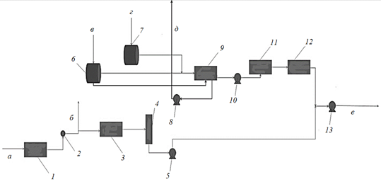 Fig. 2. Flowchart of preparing water for injection into the reservoir: a – seawater from the water intake system;