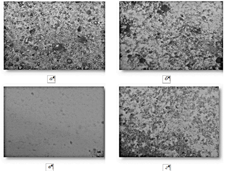 Было составлено 5 образцов, включающих различные комбинации используемых материалов. Образцы выдерживались в нормальных условиях 24 ч. По истечении времени проба каждого образца была исследована под микроскопом (рис. 4).