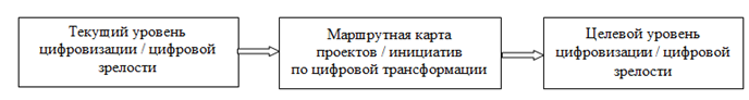 Стратегия цифровой трансформации состоит из трех составляющих (рис. 1) [8, 9], где AS IS показывает положение цифровой стратегии в настоящий момент, TO BE определяет, каким образом данная стратегия будет реализована в конечном счете, маршрутная карта указывает оптимальный путь достижения цели за счет определенных проектов и инициатив.