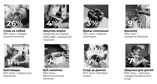 Сервисы экспресс-доставок развиваются настолько быстро, что в конкурентной борьбе позволяют покупателям сделать минимальный заказ на 1-2 товара повседневного спроса и быстро их получить. Это привело к перераспределению спроса между различными типами потребительских корзин в сторону выравнивания их значимости. Покупатель все реже выставляет конкретные цели онлайн-шопинга, предпочитая разнообразие в корзине. Происходит это благодаря крупным торговым площадкам (маркетплейсам), которые предоставляют широкий ассортимент товаров множества отдельных продавцов, представляя собой новую версию универсального магазина. Несмотря на стремление разнообразить корзину, потребитель обращает особое внимание на скидки, промоакции, цены, 73 % сравнивают цены онлайн и офлайн, а почти половина покупателей считает, что может найти более низкие цены именно онлайн благодаря обилию промоакций. Так, доля промопродаж в онлайн-магазинах составила 67 %, в офлайн – 45 %. Благодаря такому потребительскому онлайн-подходу часть рынка выступает драйвером органического развития FMCG-рынка как такового, несмотря на общий неблагоприятный деловой и экономический климат в стране.