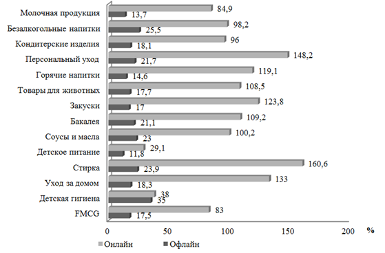 В 2022 г. в ряде категорий доля продаж онлайн также достигла рекордных показателей: 52 % подгузников, 40 % кормов для собак, 21 % зернового кофе, 13 % стиральных порошков, 8 % воды продаются онлайн [2].