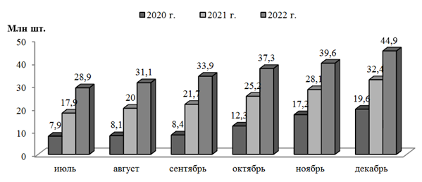 Рис. 3. Динамика количества интернет-заказов в сегменте e-grocery (июль–декабрь 2020–2022 гг.)