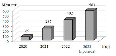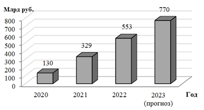В 2020 г. объем рынка составлял 130 млрд руб., в 2022 г. – уже 553 млрд руб. (рост насчитывает 425 %), к концу 2023 г. планируется увеличение еще на 40 % по отношению к итогам 2022 г.