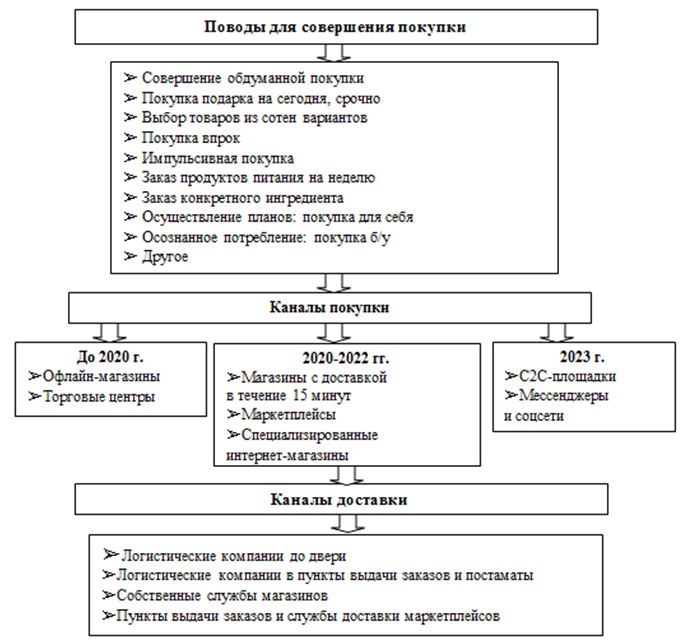 Для повышения конкурентоспособности онлайн-продавцы вынуждены расширять каналы сбыта своей продукции, т. к. это напрямую влияет на объемы продаж и зависит от поводов для совершения покупки (рис. 6).