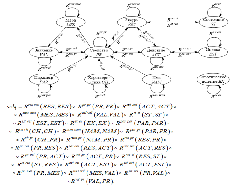 где RES = Xres, PR = Xpr, ACT = Xact – множества базисных понятий, обозначающих ресурсы, свойства и действия соответственно. Построим на X полный граф G = <X, R> и получим классификацию базовых отношений R = {Rres res, Rpr pr, Ract act, Rres pr, Rpr res, …} [24], где «… Rres res, Rpr pr, Ract act, Rres pr, Rpr res, …» – множества отношений «ресурс – ресурс», «свойство – свойство», «действие – действие», «ресурс – свойство», «свойство – ресурс» и т. д. соответственно» [24, с. 246]. В работе [25] подробно представлен комплекс правил склеивания ролевых конструктов на основе базовых отношений.