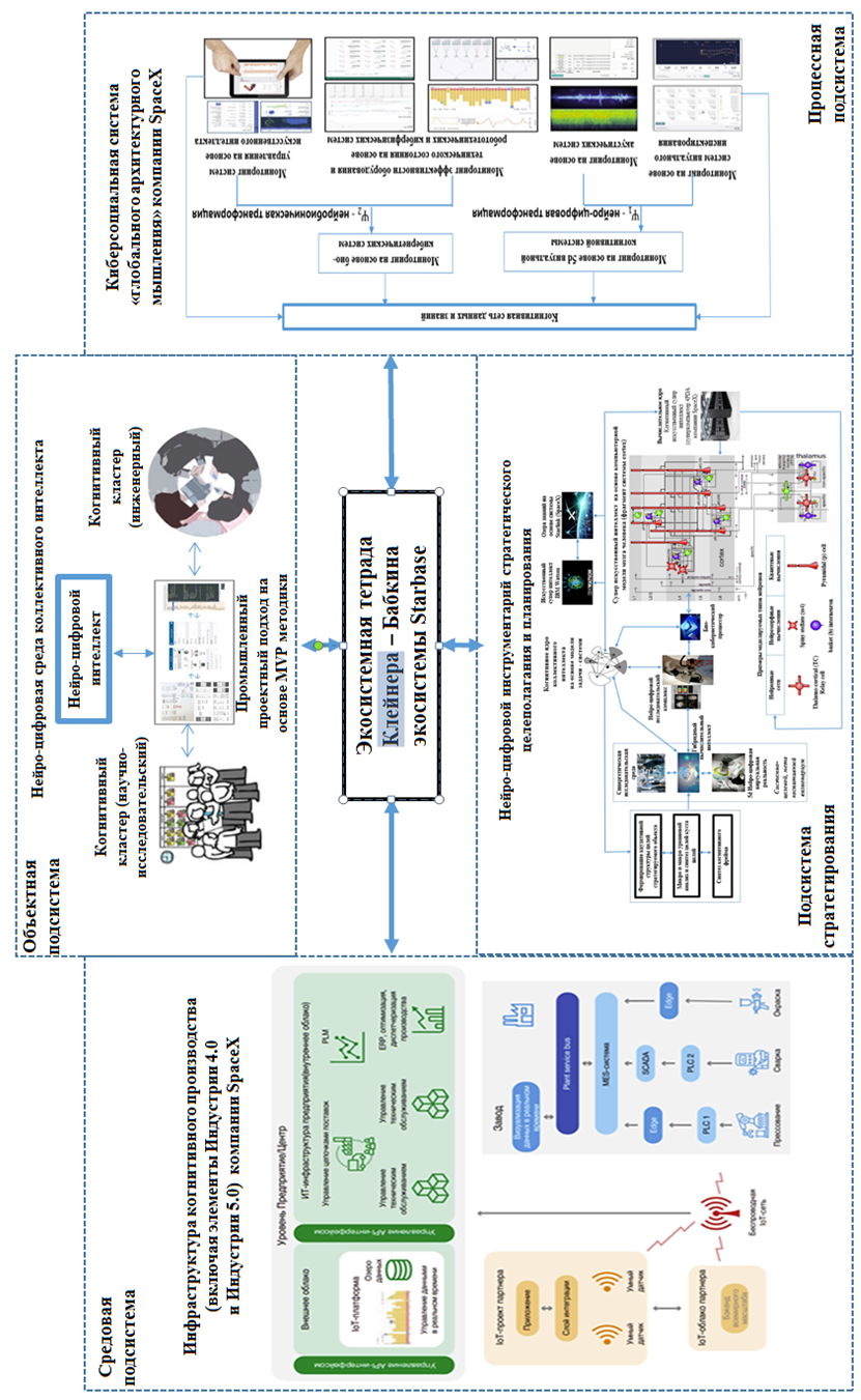 На рис. 7 представлена архитектура системной тетрады киберсоциальных экосистем компании SpaceX, которая включает в себя комплекс элементов (на разработку у авторов статьи совместно с сотрудниками компании SpaceX ушло около 10 лет), подробно представленных в соответствующих научных работах: