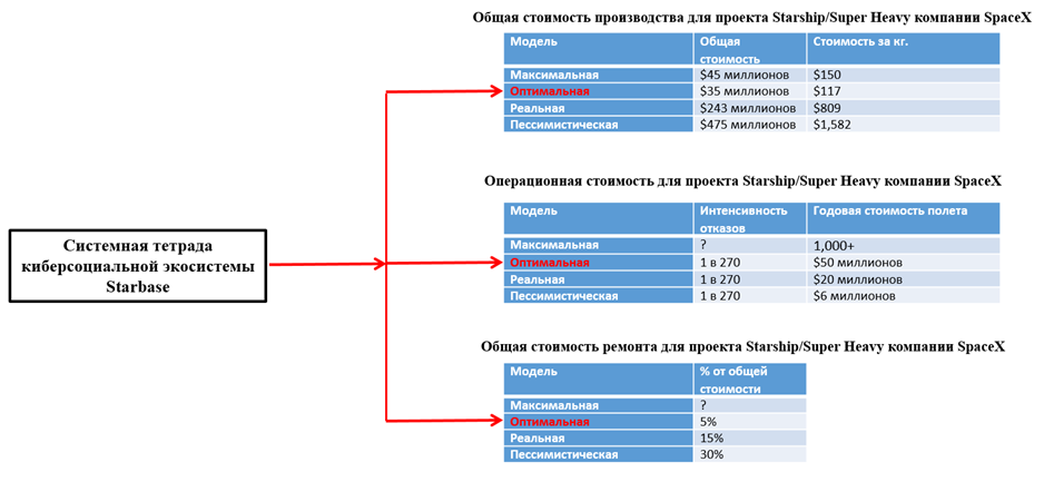 Оптимистическая модель связана в первую очередь с применением в процессе производства и запуска Starship с космодрома Starbase прорывных парадигм, методов, моделей, технологий и т. д. [26]. Реалистическая модель предполагает некоторое улучшение производства на основе уже существующих, а также усовершенствованных подходов и технологий [26]. Пессимистическая модель предполагает, что применение в процессе производства и запуска Starship с космодрома Starbase как прорывных, так и просто усовершенствованных подходов, методов, моделей, технологий и т. д. не сможет принести каких-либо существенных улучшений [26]. Наконец, максимальная модель основана на применении Святого Грааля (небывалого научно-технологического озарения) в области прорывных парадигм, методов, моделей, технологий и т. д. [26]. По оценкам Илона Маска, оптимистическая модель – это эталонная модель, т. е. то, к чему должна стремиться компания [26]. Однако более глубокое изучение и анализ, проведенный компанией SpaceX, доказал [29, 30], что полностью «оптимистическая» модель – это по сути «…королевский флеш условий [30, с. 84]», который достичь будет очень сложно. Для того чтобы добиться реализации такой модели, по трем основным компонентам (общая стоимость производства для проекта Starship/Super Heavy компании SpaceX, операционная стоимость для проекта Starship/Super Heavy компании SpaceX, общая стоимость ремонта для проекта Starship/Super Heavy компании SpaceX) должны быть достигнуты оптимальные модели развития экосистемы Starbase [26].