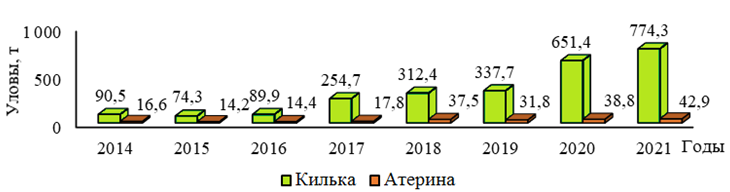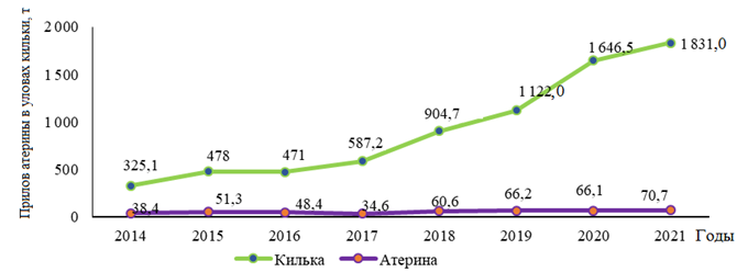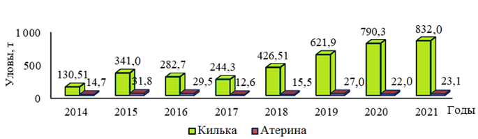 По данным промысловой статистики, уловы атерины в 2014–2021 гг. варьировали от 0,1 до 10,69 т (в среднем 4,4 т) и по отношению к экспертной оценке занижались в десятки и сотни раз. Несовпадение показателей экспертной оценки и фактического вылова данного вида отражает всю проблему организации его добычи. Из-за отсутствия возможности быстрого сбыта атерины (ввиду отсутствия приемных мощностей для хранения) при большой доле атерины в ловах невода промысловики открывают котлы и выпускают весь улов в море. В связи с этим в настоящее время освоение рекомендованного вылова атерины находится на крайне низком уровне. При осуществлении мероприятий, направленных на сохранение всей добываемой продукции и наращивание прибрежного лова обыкновенной кильки ставными неводами, можно существенно увеличить объемы добычи атерины.