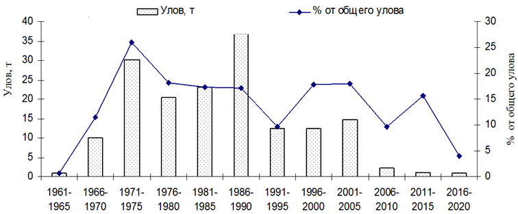 Судак. В 1948–1954 гг., по предложению Карельского отделения ГосНИОРХ, была проведена перевозка разновозрастного судака из Онежского озера в Выгозерское водохранилище, где он расселился по всему водоему. В настоящее время Выгозерское водохранилище является одним из первых в Карелии водоемов, расположенных в бассейне Белого моря, где успешно акклиматизировался судак. В прилове промысловых орудий лова судак стал появляться в заметных количествах (до 5,7 % от общего вылова) с 1962 г. Максимальной величины уловы судака на водоеме достигали в 1970–1980-е гг., затем, согласно официальной статистике, добыча судака снижается. Вылов его с 1962 по 2020 гг. колебался в общих уловах 0,3–44,9 % (рис. 1).