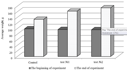 The level of total whey protein at the beginning of the study for tests No. 1 and 2 was low, but it was within the normative values and relatively homogeneous. Variability was 1.5-4.0%. The obtained low data on the concentration of total protein in the blood before the start of the experiment indicate a high level of stress load, which can be overcome due to the additional energy obtained in the course of protein disintegration. At the end of the experiment, the indicators of total protein were for certain higher in tests No. 1 and 2 by 17.4 and 22.2% compared with the control sample. Such dynamics corresponds to the data on the growth rate. At the end of the experiment in tests No. 1 and 2 the glucose dynamics was within the physiological norm (from 3.0-4.0 g/l), which is the result of the normal operation of the enzymatic system that catalyzes the transformation of glucose, the control group was characterized by low glucose concentrations below the reference values.