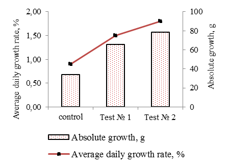 In test No. 1 fish consumed feed with astaxanthin proportion of 20 mg/kg, its average daily growth rate was 94.1% higher than that of the control. The absolute increase in live weight in fish of the first group was 65.8 g versus 78.3 g in the second group, which was 1.9 and 2.3 times higher than in fish of the control group.