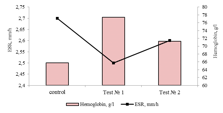 Sedimentation rate of erythrocytes and hemoglobin in all variants of the experiment remained within the normative values, which indicates a constant protein composition of blood plasma. According to the ESR indicator, no differences were found in the study variants (p > 0.05).