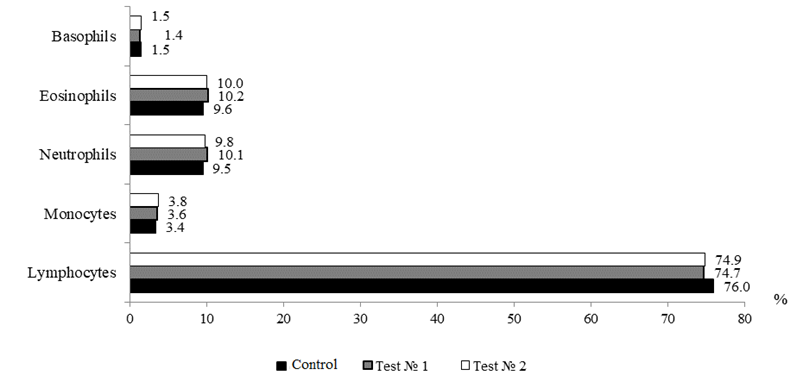 The leukocyte blood formula, which reflects not only the physiological state of fish, but also some aspects of cellular immunity, is a fairly informative indicator in assessing the overall physiological state of the body. Changes in the leukogram can detect metabolic disorders and deterioration of the studied object long before the manifestation of clinical signs of emerging pathologies [14]. The leukocyte formula of the blood of the fish under study is presented in accordance with Fig. 5.