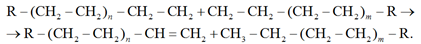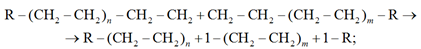 в) обрыв цепи, характеризующийся прекращением роста молекулы (взаимодействие растущих радикалов с образованием неактивных молекул полиэтилена рекомбинацией или диспропорционированием):