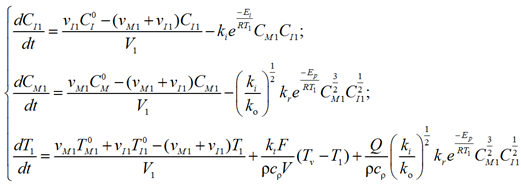 Так как реактор проточный и на его входы подаются этилен и инициатор, то уравнения материального и теплового баланса по этим веществам можно представить в виде модели идеального смешения для непрерывного реактора.