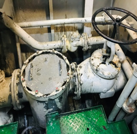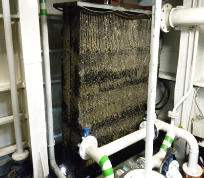 В результате интервью с механиками теплохода «Петробалк 1» в августе 2020 г. было выявлено, что для охлаждения бокскулера нужна постоянная проточная вода. Однако во время работы на мелководье в летний период в бассейне Азовского моря при температуре забортной воды более 25 °С главные двигатели превышали допустимую температуру воды и масла, возникала необходимость снижения нагрузки на главный двигатель посредством снижения его оборотов по причине низкой работоспособности системы охлаждения. Бокскулеры подвергались загрязнению забортной водой (рис. 9).