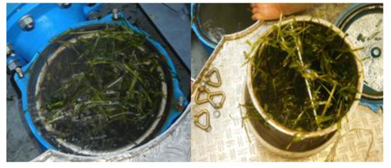 На судне «Балт Флот 15» во время исполнения рейса в 2020 г. «Туркменбаши – Азербайджан (Апшерон)» произошло засорение кингстонных ловушек водорослями. Была произведена активная подача воздуха в кингстонные ящики и активирована резервная система охлаждения, открыт прием воды из балластных танков. Ледовые условия создают дополнительную нагрузку на работу системы охлаждения судна. Согласно предоставленной информации экипажа судна при его эксплуатации в ледовых условиях было выявлено забивание мелкими фракциями льда решеток кингстонных ящиков, а также «шугой» (смеси льда и воды) – фильтрующих элементов фильтров забортной воды (рис. 13), что способствовало перегреву двигателей, вплоть до их полной аварийной остановки [11].