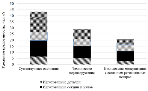 Согласно расчетам в случае комплексной модернизации предприятий с созданием региональных центров трудоемкость изготовления корпусов заказов снизится более чем в 2 раза (с 43,3 до 21 чел.ч/т).
