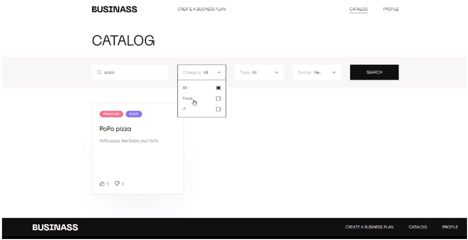 Программное решение разработано в соответствии с моделями проектирования, представленными в статье. Серверная часть реализована на языке программирования JavaScript с использованием фреймворков Node.js, Express.js и микросервисной архитектуры (RabbitMQ). В качестве СУБД была выбрана MySQL, для кеширования используется Redis. Клиентская часть также реализована на JavaScript с использованием библиотек React, Redux. Тестирование системы реализовано посредством Jest, RTL и Cypress. Для локальной разработки используется Docker. Программное решение позволяет осуществлять навигацию по бизнес-идеям в удобном автоматизированном формате, значительно сокращая трудоемкость выбора подходящего проекта с учетом его характерного типа, заданного бюджета и категорий затрат.