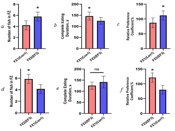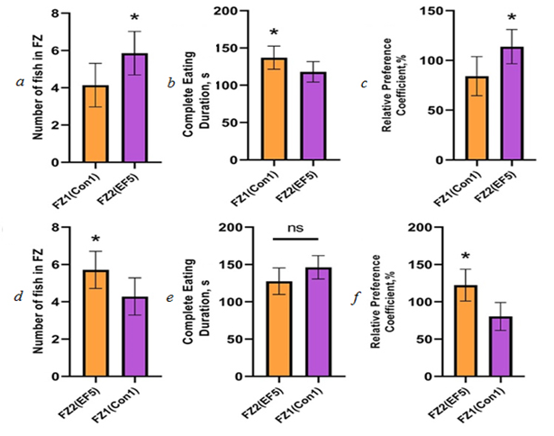 of experiments (EF3): a, d – number of fish in the feeding area; b, e – time of food eating, CED; c, f – relative attractiveness of the food, RP; ns – no significant difference; * – significant difference by t-test with Welch's/Mann–Whitney correction
