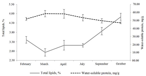 The lipid content in fish muscles is highly variable during the annual cycle [17-19]. The results of the study of total lipids and water-soluble protein in atherina muscle tissue from February to October are shown in Fig. 1.