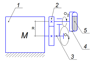 The electric motor 1 drives the crank 3, the shaft of which contains a pressed gear of gear 2. At the end of the crank there is a hole for placing a roller, one of the ends of which is occupied by the counter gear wheel 2, the second is occupied by holder 4, in which vessel 5 for the regenerated solution of the additives is clamped. So, the crank 3 is a planetary carrier, which runs the small gear of the gear wheel 2 around the large one. It promotes the double law of rotational motion of the vessel 5 in its holder – movement along the radius R of a large circle by the shaft of motor 1 around the O1 axis with an angular velocity ω1 and rotational motion with a speed ω2 relative to the O2 axis of the roller with the counter gear. The angular velocities are related by the relation ω2 = 2.5ω1. The main goal of this combination of mutual rotational movements of the vessel with the additive solution is to uniformly mix its components in the volume of the solution.