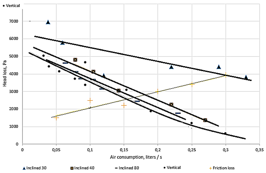 Analyzing the experiments carried out, we can say that the pressure loss in the studied inclined pipes is in the range from 0.5 to 7 thousand Pa.