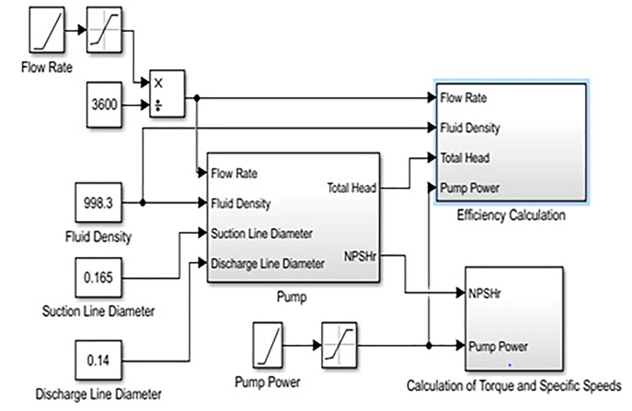 MATLAB Simulink application is used to simulate a centrifugal pump. Simulink is a flowcharting environment for multi-domain modeling and model-based design. It supports simulation, automatic code generation, and continuous testing and verification of embedded systems. Simulink provides a graphical editor, custom block libraries, and solvers for modeling dynamic systems (Mathworks 2018). Performance diagrams, operational information on pipeline lengths and design parameters were provided from the design documentation for the Ivan Poddubny type vessel. Total head (H), specific rotation speeds (nq), torque, pump efficiency and NPSHr equations were coded into the model using the obtained data. Pump efficiency can be calculated using the formula: