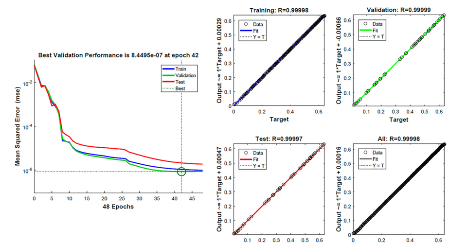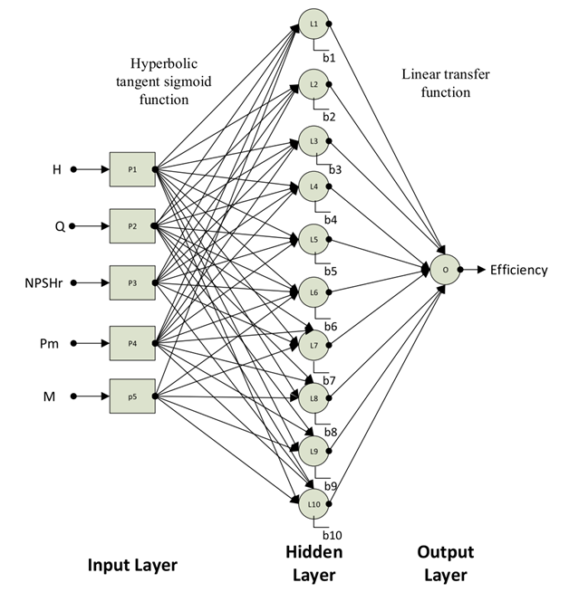 Table 2 illustrates the network information. A number of layers ranging from 1 to 5 were tried. Using one hidden layer and one output layer provided optimal results in this model. In addition, numbers of neurons ranging from 1 to 20 were tried, and 10 neurons were decided to be suitable for testing. The Levenberg-Marcourdt, Bayesian regularization, and scaled conjugate gradient algorithms were tested as a training function. The model with the Levenberg-Marcourdt algorithm had better performance for optimizing ANN parameters (bias and weight). The algorithm has wider application in similar studies. The percentages for training, validating and testing the network were determined by testing different options to avoid overfitting. After testing, it was decided to use 70% training, 15% checking and 15% testing. The network has network inputs Q, H, NPSHr, Pm and M. The parameters were selected using the mathematical relationships of the model and studying similar studies. The result is efficiency, so the network can evaluate the performance of the model. Supervised learning was carried out using a neural network with feedforward feedback. This way the output will be informed by the input layer. Input variables are then passed through these layers. The transfer process was carried out by transferring functions. After this, the variables participate in the hidden layers through the connection of neurons in the input and hidden layers. Due to the weight of neurons, fundamental estimates are hidden in the ANN. The neurons in the hidden layer weigh the sum of the outputs of the previous layers. The bias then measures the previous information and the sum of the results passed through the transfer function. The hyperbolic tangent sigmoid function was defined as the activation function.