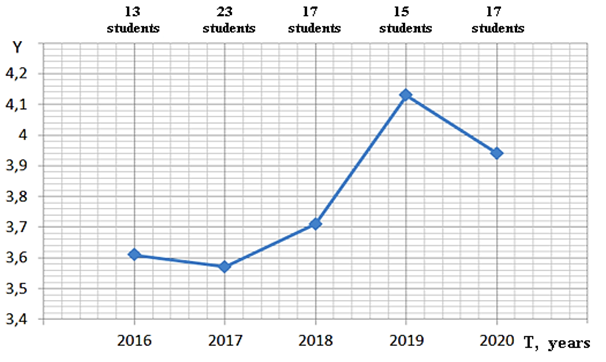 The graph above shows the positive dynamics of the results of the defense of the final qualifying work (FQW). At the second key point (2017), there was a slight decrease in the Y indicator (the average score for FQW protection). This circumstance is explained by an increase in the number of graduates in 2017 by 45%. There is also a decrease in the indicator in 2020, but this can be explained by the peculiarities of restrictions caused by the COVID-19 coronavirus infection. In general, the application of the educational trajectory has had a positive impact on the professional training of students. Also, in the course of its application, it was necessary to solve a number of old problems with the material and technical base, computer equipment [11] and personnel [12].