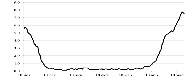 В «летний» сезон (с мая по октябрь) судаки в садках получали искусственные корма Biomar Efico Sigma 840 (Дания). В зимний период (с конца октября по май) судака в садках не кормили. Рыб из озера для исследований отлавливали 15–17 октября 2021 г. и 10–15 мая 2022 г., из садков – 25 октября 2021 г. и 15 мая 2022 г. Температурный режим воды в период зимовки судаков в озере (и, соответственно, в садках) приведен на графике (рис.).