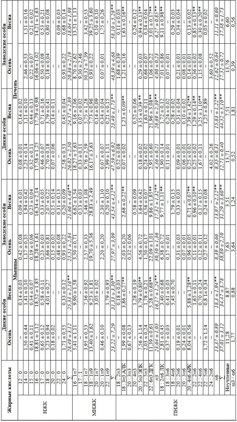Доля МНЖК в печени диких рыб за зимовку снизилась в 2 раза при более чем трехкратном повышении ПНЖК. У заводских рыб, напротив, доля МНЖК повысилась в 1,2 раза, ПНЖК – существенно не изменилась (см. табл. 3).