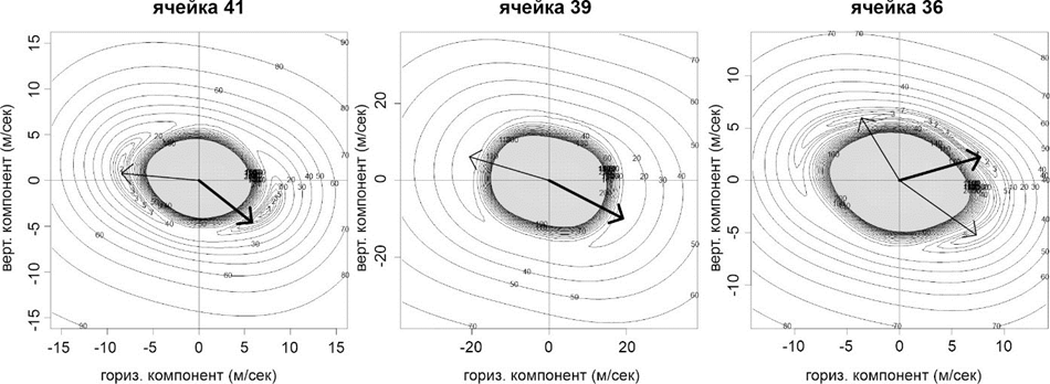 Уравнение (1) не учитывает влияние других параметров, кроме приповерхностного ветра. Одним из неучтенных факторов является дождь. Дождь изменяет обычную поверхность океана, а на частоте 13,4 ГГц он рассеивает мощность излучения скаттерометра, что приводит к значительным ошибкам при определении приповерхностного ветра. На рис. 5 приведен пример того, как дождь искажает данные о приводном ветре. На рис. 5, а представлен выделенный ряд векторов ветра. Ячейки 41 и 36 не загрязнены дождем, а ячейка 39 попала под дождь [10].