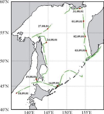Fig. 7. The route of the STS Nadezhda and the dates of selection ship and satellite data