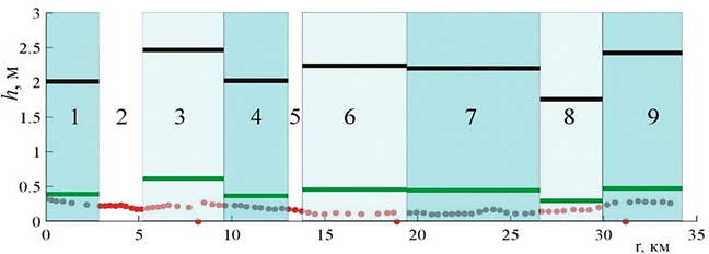 точки – судовые измерения; 1, 3, 4, 6–9 – пиксели, используемые для расчета;