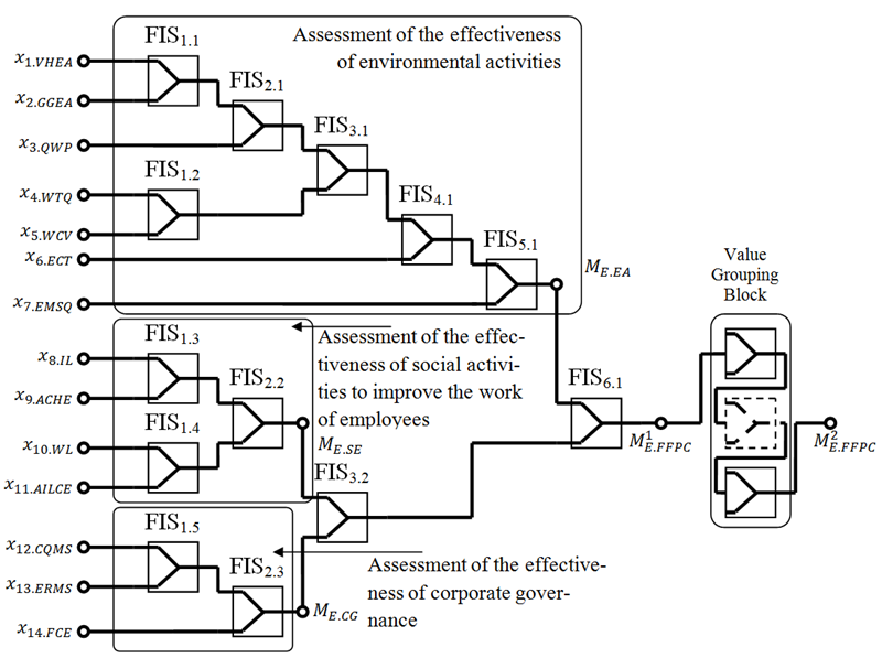 where ϜE.FFPC, FE.EA, FE.SE, FE.SE, FE.CG are operators for processing information about the value of input variables. A feature of the variables that are used to obtain estimates of ME.FFPC, ME.EA, ME.SE and ME.CG is the uncertainty associated with the formation of an operator for their aggregation, and the experts of the respective fields of knowledge have information about the features of these variables interaction. Therefore, taking into account [8, 9], for the implementation of the operators ϜE.FFPC, FE.EA, FE.SE, FE.CG, it is proposed to use the provisions of the theory of fuzzy sets and fuzzy inference.