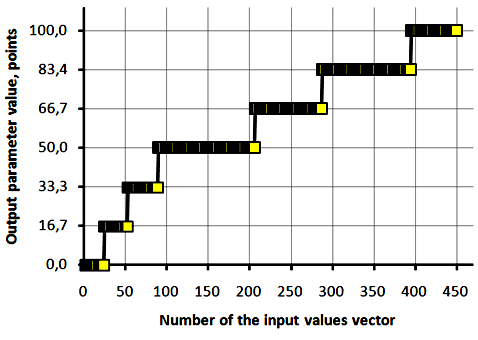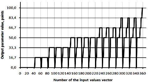 In the second stage of the experiment, the vectors of values that characterized the state of the object of evaluation were fed to the input of the HFIS. The range of values for each element of the vector (input variable) was chosen as a random number from the range from 0 to 100 points. In total, 450 vectors were fed to the input of the computer complex. After the experiment, the results were sorted in ascending order with respect to the assessment . The results of the experiment are shown in Fig. 4.