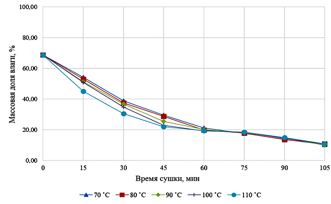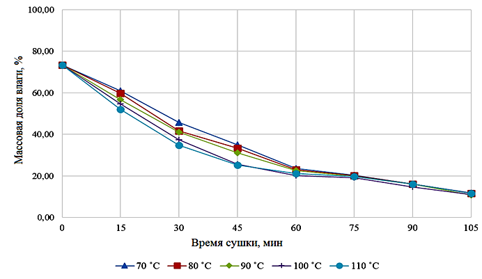 График изменения массовой доли влаги в порошке из антенн креветки в зависимости от температуры и времени сушки представлен на рис. 1.