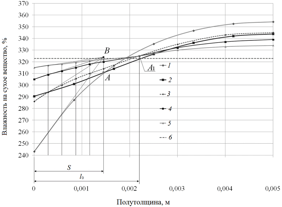 В процессе релаксации влаги сухой слой увлажняется и его граница перемещается вправо до точки А1 или далее, пока влажность в образце не выровняется до среднеобъемной влажности (см. рис. 3).