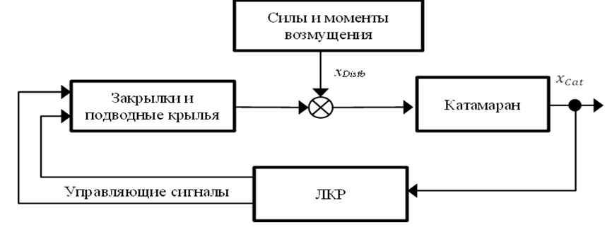 На рис. 2 приведена структурная схема [6, 9], на которой показано взаимодействие элементов катамарана (динамика объекта, контур управления по состоянию катамарана, исполнительные механизмы) и возмущений.