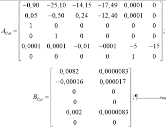 – матрица системы катамарана с обратной связью, ACat – матрица объекта, BCat – матрица управления, K – матрица обратной связи;