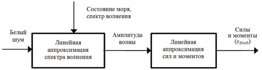 Качка катамарана возникает в результате воздействия внешних сил и моментов, создаваемых морскими волнами. Имитация этих сил и моментов выполнена с помощью метода формирующего фильтра [12] (рис. 3).