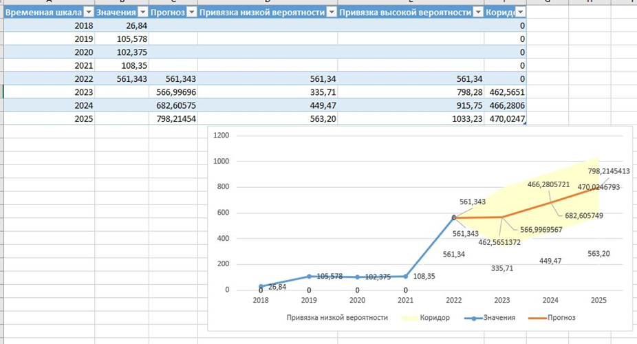 Помимо очевидной тесной зависимости показателей выручки и величины социальных инвестиций, прогноз прибыли методом экспоненциального сглаживания показал, что при сохраняющейся тенденции роста объема вложенй на реализацию инструментов социально-этического маркетинга ГК «ЭФКО» будет обеспечен рост прибыли – базового показателя эффективности деятельности хозяйствующего субъекта. Так, прогноз прибыли с вероятностью 95 % указывает на устойчивый рост показателя на период до 2025 г., что в очередной раз подтверждает нашу гипотезу о целесообразности и положительной корреляции данных показателей в деятельности социально ориентированной организации (рис. 6).