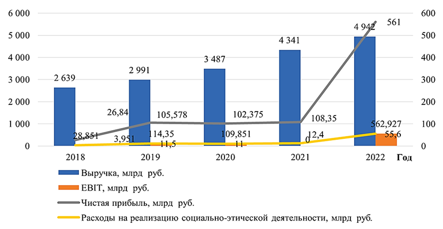 При высокой степени диверсификации инструментов социально-этического маркетинга, используемых в практике управления ГК «ЭФКО», высоком уровне социальной активности, перманентных инвестиций на реализацию социально-этических мероприятий и программ, деятельность хозяйствующего субъекта является экономически эффективной. Так, согласно результатам анализа показателей финансово-хозяйственной деятельности ГК за период 2018–2022 гг. на фоне растущих инвестиций на реализацию социально-этической деятельности зафиксирован перманентный рост таких показателей, как объем продаж продукции (выручка в сопоставимых ценах), прибыль до налогообложения (EBIT), чистая прибыль (рис. 4).
