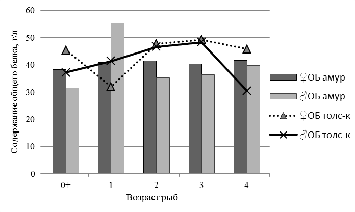 у этих рыб увеличивается по сравнению с весной, за исключением толстолобика, у которого количество глобулинов в сыворотке крови выше весной. Половые различия в данных показателях наиболее заметны у рыб в возрасте от 0+ до 2 лет, у более взрослых особей рыб не обнаружено достоверных половых отличий по данным показателям. Уровень общего белка, альбуминов и глобулинов в сыворотке крови растительноядных рыб изменяется с возрастом. У белого амура максимальное содержание этих компонентов отмечено у годовиков, у белого толстолобика больше всего общего белка и глобулинов содержат трехлетние особи.