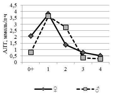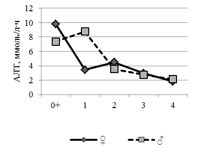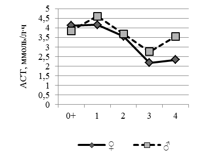 У белого толстолобика четко прослеживается сходство возрастной динамики активности АСТ у самок и самцов. У самцов белого амура и белого толстолобика обоих полов наибольшая активность АСТ показана у годовиков (4,1–4,6 ммоль/л∙ч) с тенденцией к дальнейшему снижению. У самок белого амура пик активности АСТ наблюдается у сеголеток (3,5–3,9 ммоль/л∙ч), у особей старших возрастных групп значение этого показателя тоже падает в 1,5–2 раза.