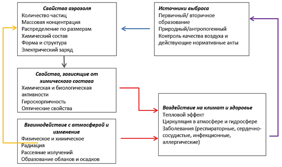 Рис. 1 иллюстрирует наличие и характер функциональных связей между составом аэрозоля, зависящих от свойств, взаимодействия с атмосферой и изменения частиц выбросов при их попадании