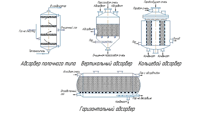 Адсорбционная очистка газов реализуется в адсорберах, которые по способу организации можно разделить на адсорберы периодического или непрерывного типа. По виду движения твердого поглотителя, т. е. адсорбента, адсорберы можно разделить на три класса: адсорберы с движущимся слоем адсорбента (гиперсорберы), с псевдоожиженным (кипящим) и стационарным (неподвижным) слоем адсорбента. Самое широкое распространение на практике получили аппараты с неподвижным слоем, т. к. их преимуществом является простота как в конструктивном, так и в технологическом плане. Модификации конструкций адсорбционного оборудования различны (рис. 2).